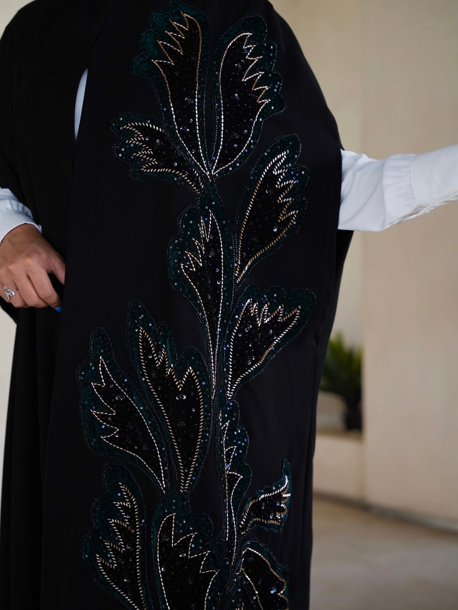 من إبداع أنامل أردنية، صُمم هذا الكاب الأسود الفاخر ليكون عنواناً للأناقة في مناسباتك الكبرى. يتميز بنقوشه الانسيابية التي تزين جانب القطعة بشك دقيق اخضر و ذهبي تلمع مع كل حركة.