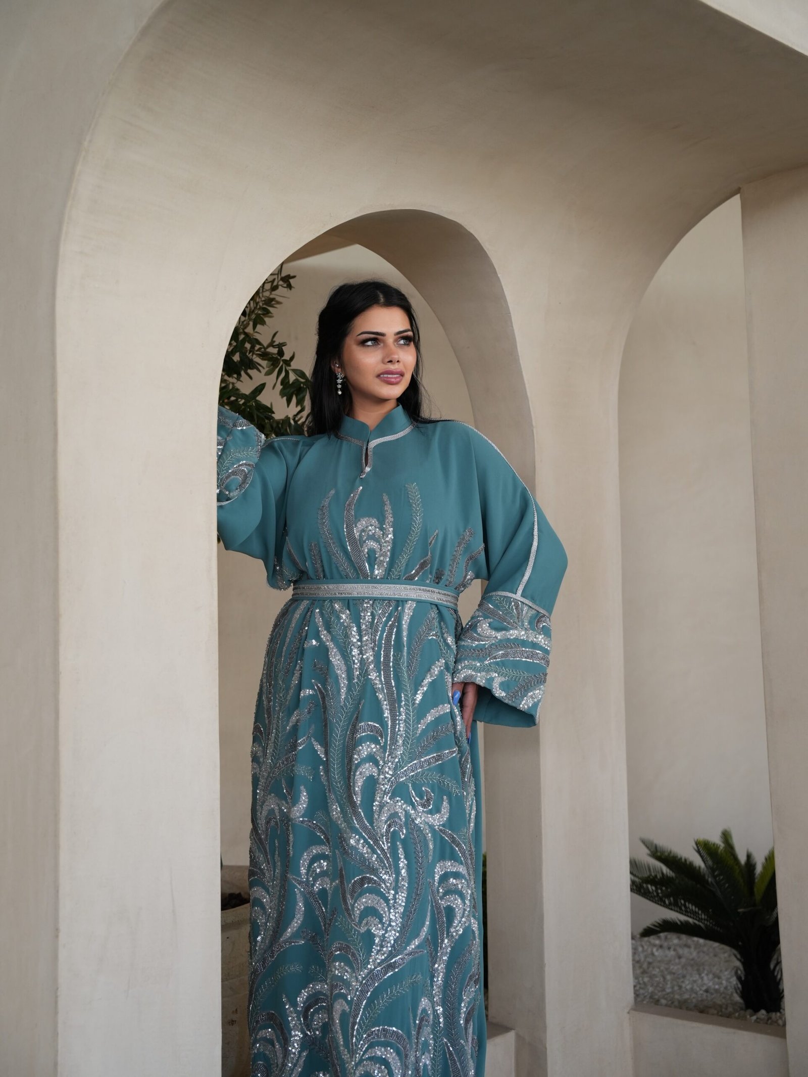 من وحي الطبيعة وجمال تفاصيلها، صاغت أنامل مصممتنا الأردنية هذا القفطان الاستثنائي من قماش المخمل الفاخر. يتميز بنقوشه الغنية والملونة التي تمزج بين الفخامة الدافئة والأناقة العصرية، مع حزام ذهبي عريض يحدد الخصر بلمسة “هيبة” ملكية.