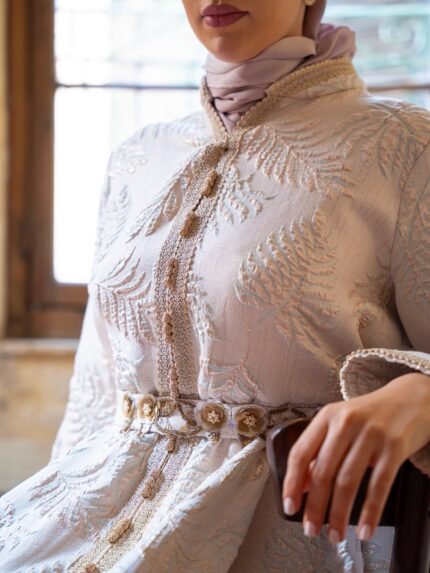 قفطان بروكار تركي فاخر بتصميم كلاسيكي أنيق مع حزام يبرز القوام، مثالي لإطلالة راقية تجمع بين البساطة والفخامة.