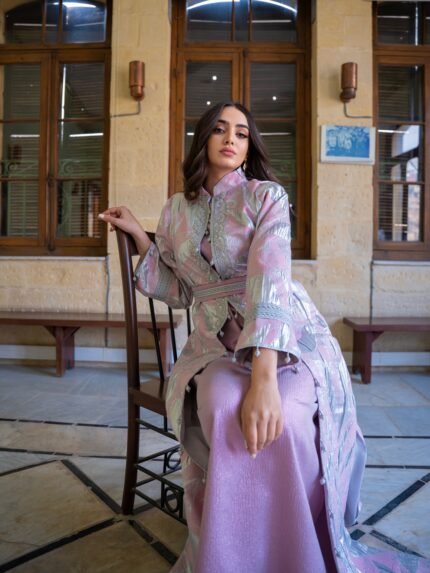 قفطان أنيق مصنوع من بروكار تركي فاخر يتميز بنقوش ناعمة وتفاصيل دقيقة تعكس الذوق الراقي والأسلوب الكلاسيكي الفخم.