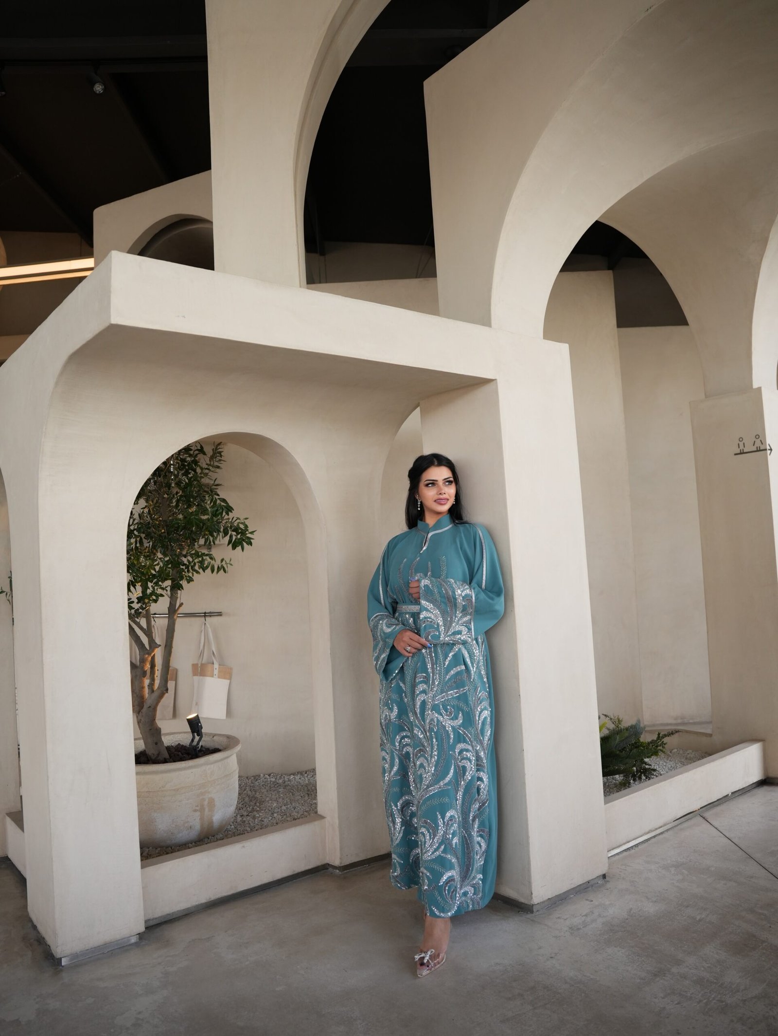 قفطان فاخر بتصميم انسيابي يجمع بين البساطة الراقية والفخامة الشرقية. يتميز بلون تركواز هادئ مع تطريز متقن بتفاصيل زخرفية ناعمة تضيف لمسة ملكية جذابة على التصميم.