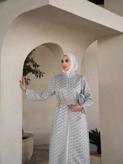 بتوقيع أردني مبدع، نقدم لكِ هذا القفطان المكون من فستان داخلي ناعم بلون اللافندر، وفوقه طبقة خارجية من البروكار الخفيف المزدان بنقوش فضية ساحرة. الأكمام المزينة بـ “العقاد” التقليدية والحزام المتناغم يضفيان لمسة تراثية بروح حديثة. كوني الوحيدة التي تتألق بهذا التصميم، حيث لا توجد منه إلا قطعة واحدة فقط
