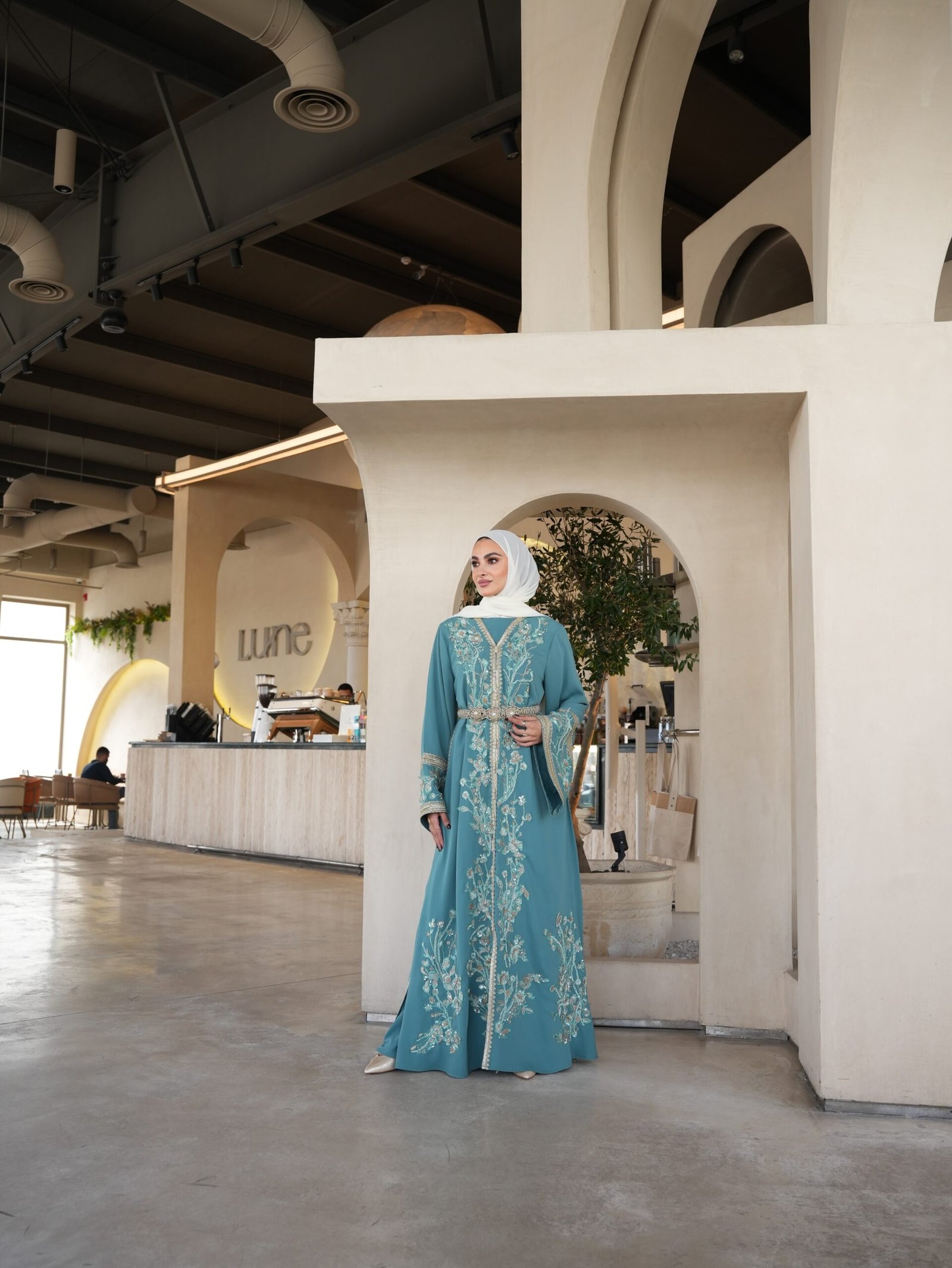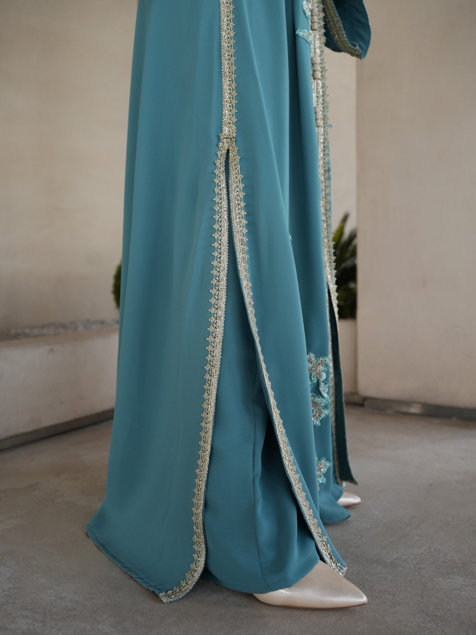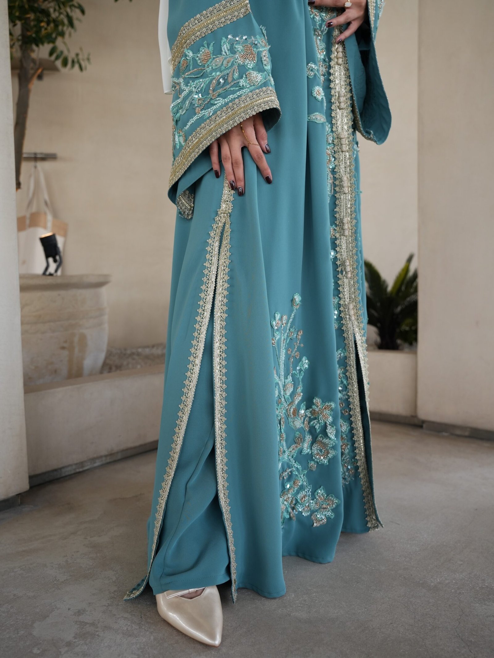 قفطان تركواز مطرز بتفاصيل فاخرة